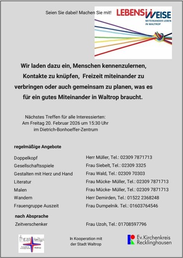 In Kooperation mit dem Kirchenkreis Recklinghausen versuchen wir so das bürgerschaftliche Engagement in Waltrop voran zu bringen, damit möglichst viele Menschen mit Freude und selbstbstimmt zusammen leben können.